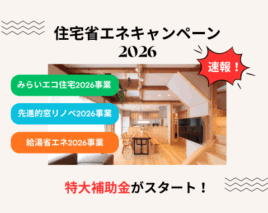 2026年1月5日 お知らせNEW 2026年「住宅省エネキャンペーン決定!」2026年も「住宅省エネキャンペーン」が始まりました! 2025年11月28日以降に着手した工事が対象となります。 <制度の概要(2026年も継続)> 目的:住宅の省エネルギー化を進め、脱炭素社会の実現や家計負担の軽減を…