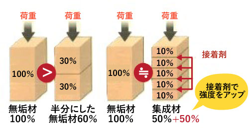特別に優れているわけではありません。一般住宅で例えれば、同じ荷重を支えるのに、1つの天然無垢材で支えるのと、半分の大きさで2段にするのとでは強度が変わります。1段の強度が半分以下になるため、2段にしても1つの材と同じ強度にはなりません。集成材ではその不足した強度を接着剤で補っているのです。