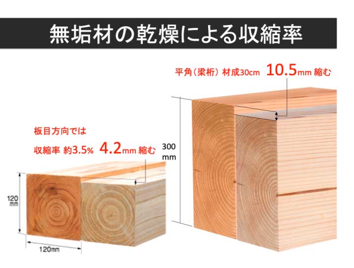 含水率30%以上の杉材を15%以下に乾燥した場合4.2㎜収縮します。