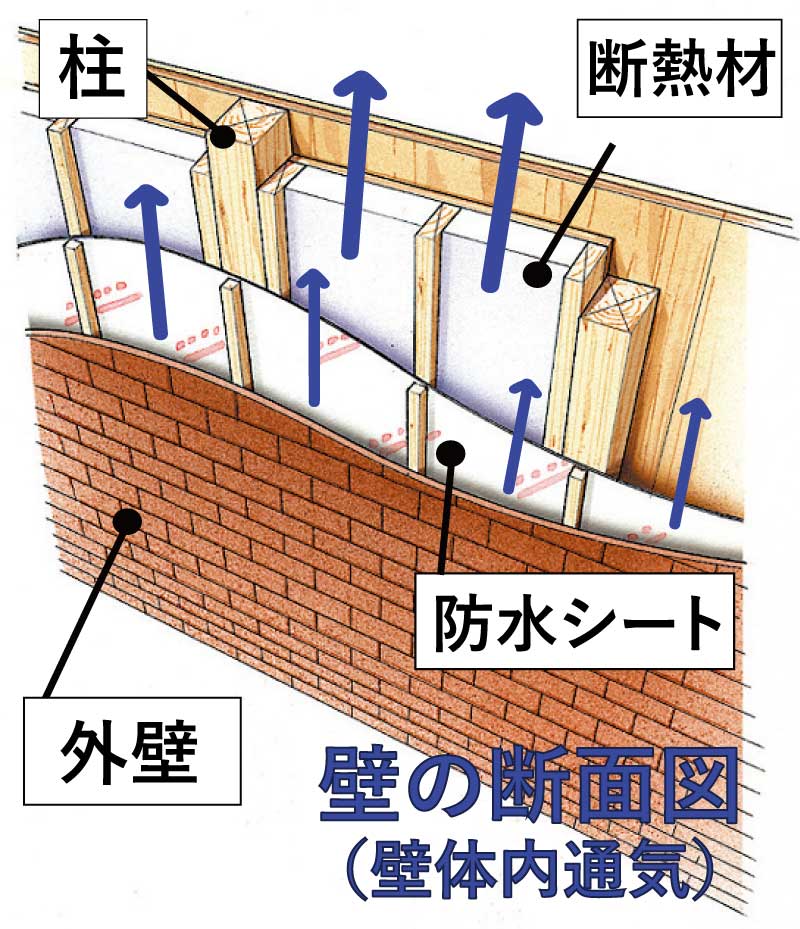 - 壁の内側に通気層をつくるので結露や湿気を防ぐ。