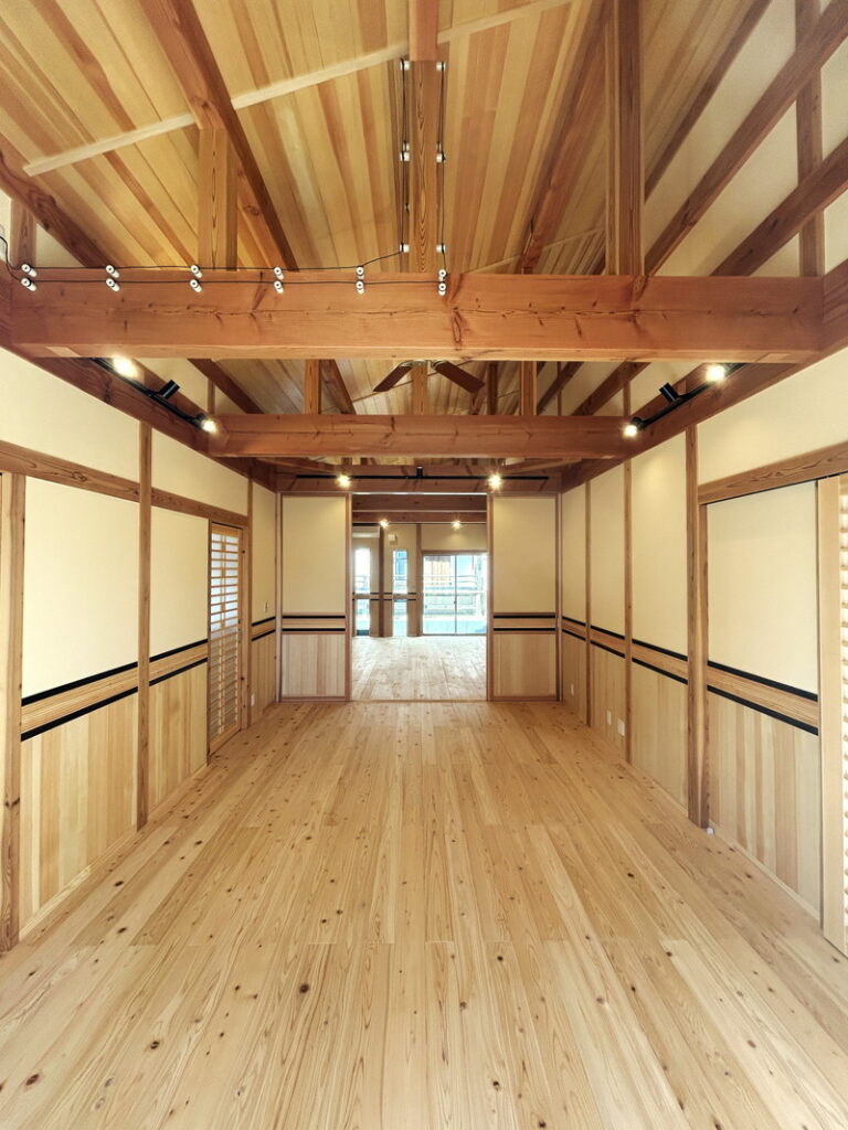 …水平梁を採用した勾配天井が、落ち着きと開放感を両立。構造美を楽しめる空間です。