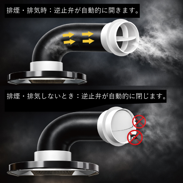 ●排気時のみ開き、逆風や外気圧で自動的に閉じる