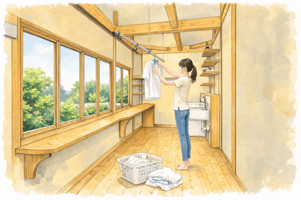 ■ 機能的なランドリールーム 洗濯機と便利な多目的流し(スロップシンク)を完備。陽だまりの中、洗う・干す ・畳むがその場で完結します。