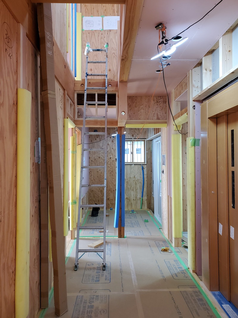 N様邸は断熱がしっかりしていますので、大工さんは割と軽装で作業しています。K部君も汗を流していたので、途中でジャンパーを脱いでました💦