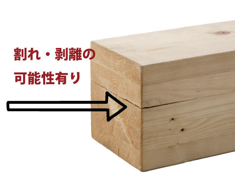 接着力が高く、水分の多いラミナでも強力にくっつきます。このため、施工後にラミナが乾燥し、収縮を始めると接着剤は剥離せず、弱いラミナの方が割れます。また、ほんの数年前まで、健康を害する可能性をもつ「ホルムアルデヒド」などを多く含んでいました。焼却処分時にもダイオキシンなど有毒な化学物質を発生させます。