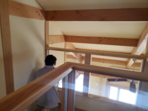 ガラス屋さんは、強化ガラスを1Fと吹き抜けとの境目に、慎重に取り付けているところでした。