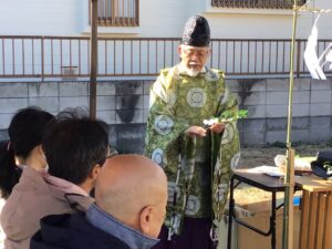 最初に、祭壇、土地、参列者をお浄めします。また、神主さんが工事の安全を祈る祝詞(のりと)を読み上げます。中々体験することもありませんので、ちょっと緊張致しますね(*^^*)