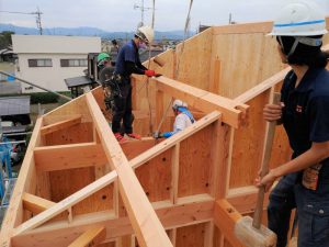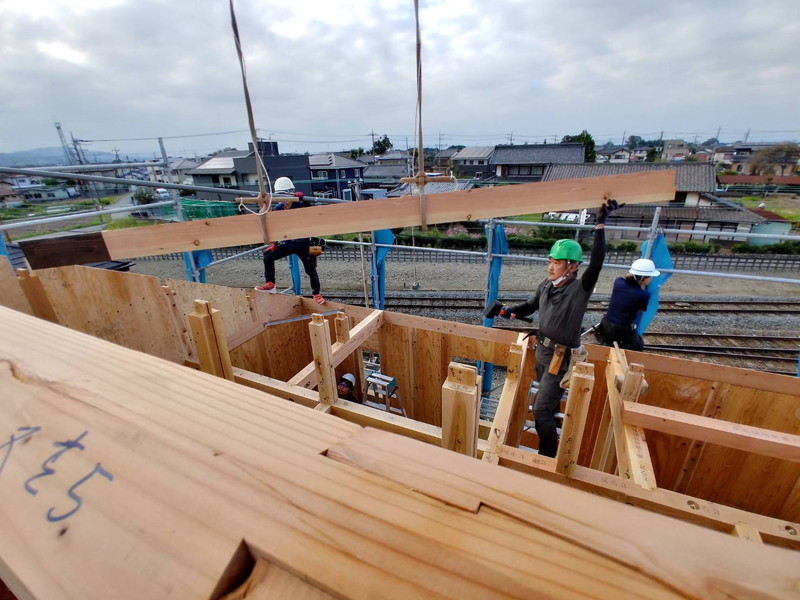 台風が差し迫る中ではありましたが、無事に建て方を完了することができました!現場の皆さんの怪我もなく、ここまで無事に完了して本当に良かったです(^^)