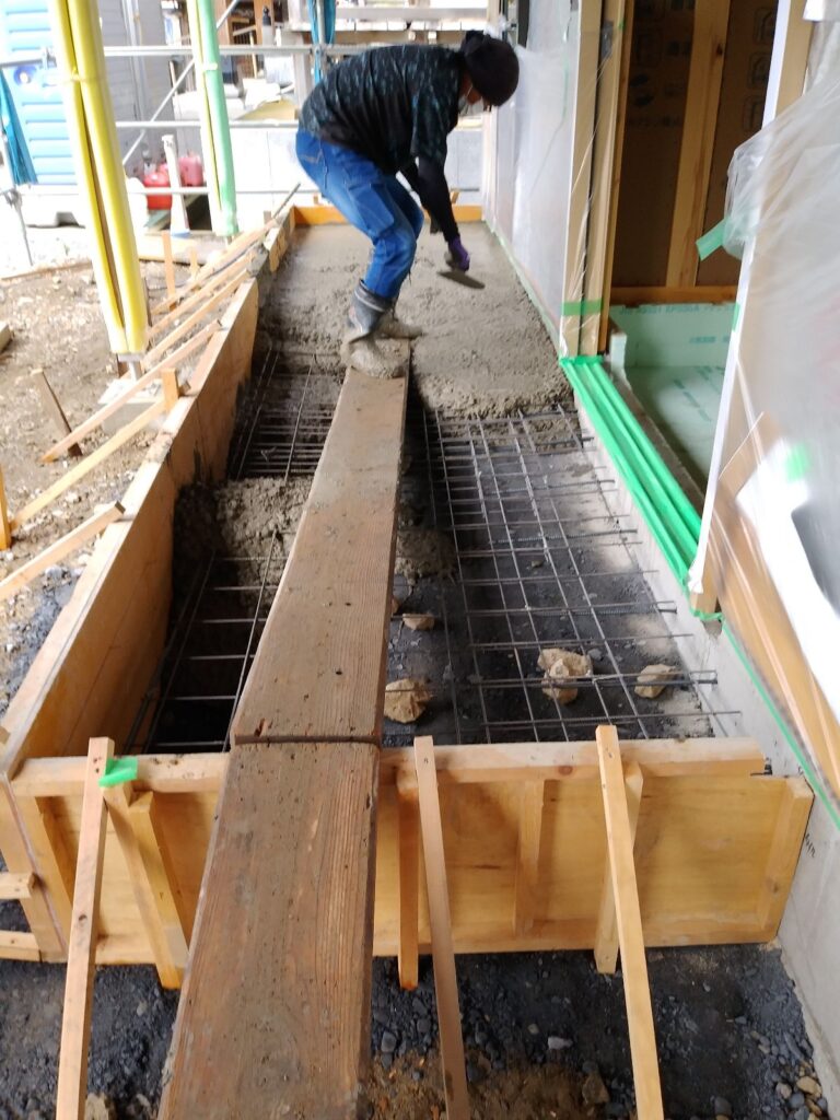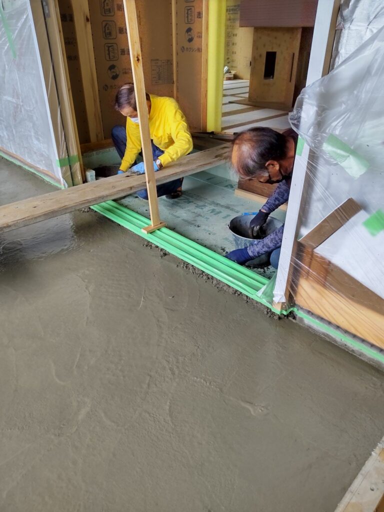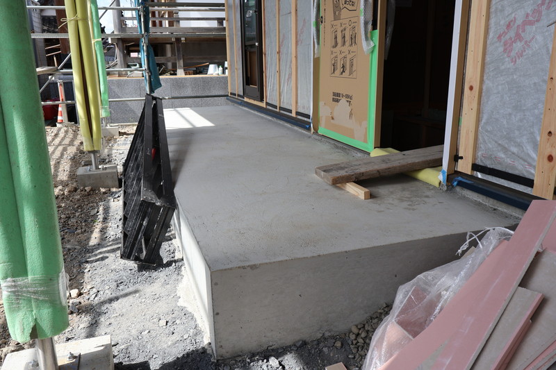 次に、馬迫現場監督が玄関ポーチを造っていました。一輪車でこの砂や砂利、モルタルを運んだと思うと、完成後はしっかり踏みしめようと思います。
