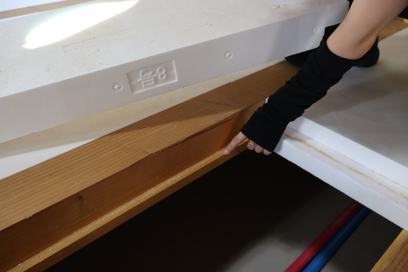 このように以前は基礎部分がまだ見える状態で、根太や大引きと呼ばれる木を伝って歩いていました。そして、この大引きの間隔をご覧ください。ヨシケンの剛床工法は一般在来の3.7倍強く、グランドピアノの荷重だってなんのその…(構造ダイジですよ‼)