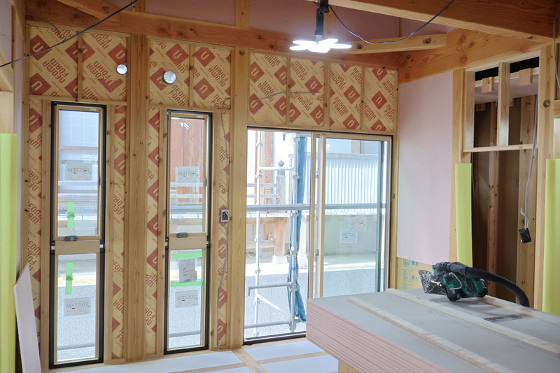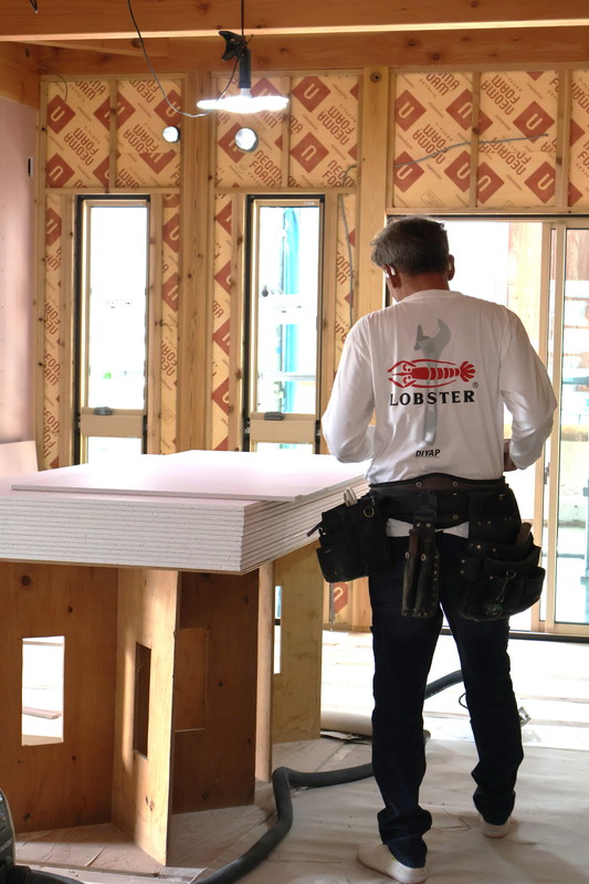 やはり足元が進まない事には作業もし辛いですし、工具や材料なども置けません。ということで真っ先に床断熱が入りました。これで足元はフラットです。落ちる心配がなくなって、KOSHIOも撮影がはかどります。