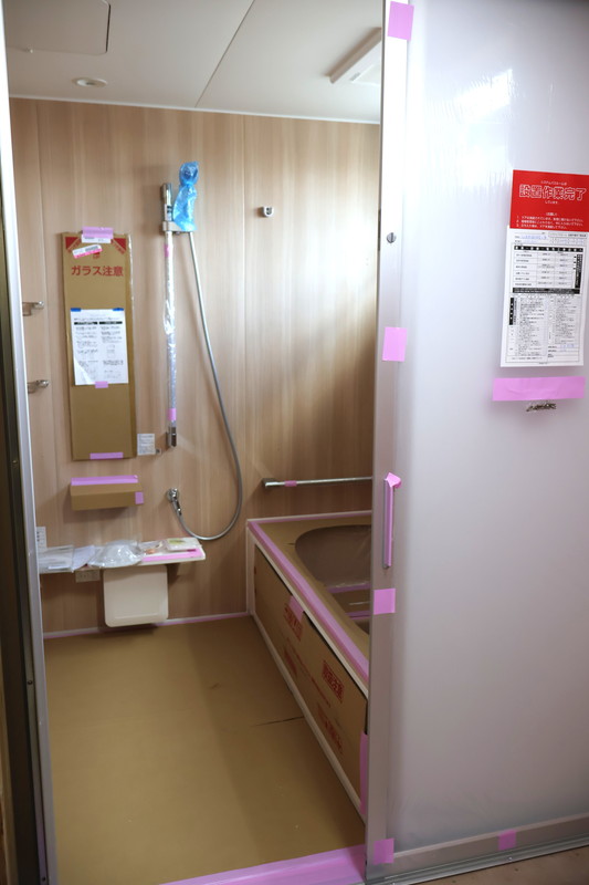 浴室内の壁は優しい色の木目模様で、毎日の入浴では疲れを癒やしてくれそうです。今はカバーがされて守られています。