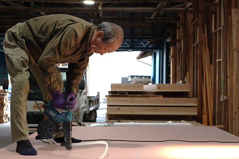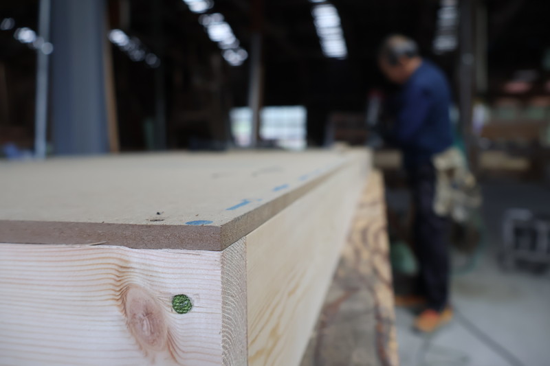 別日です。愛弟子の大工さん達が現場へ出てしまっているので、こちらの屋根パネルもお一人で造っています。「一人なら一人のやり方があんだんべ」とかっこいいことを言っていました。因みにこの大きな作業台も棟梁が造ったものだそうです。なんでも造ってしまいますね(´・ω・`)