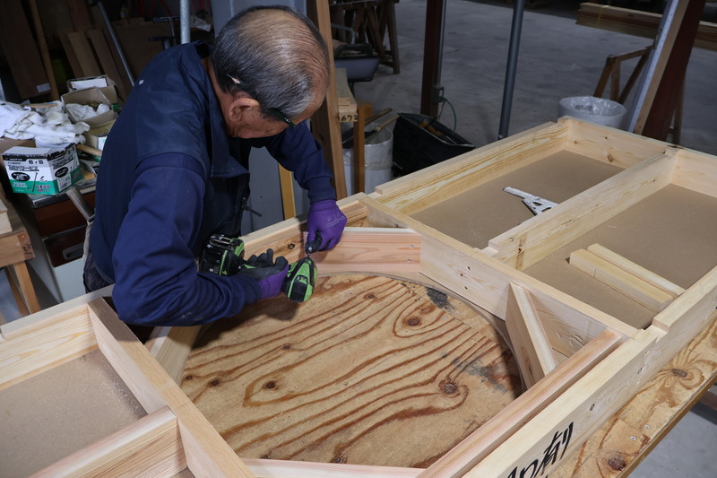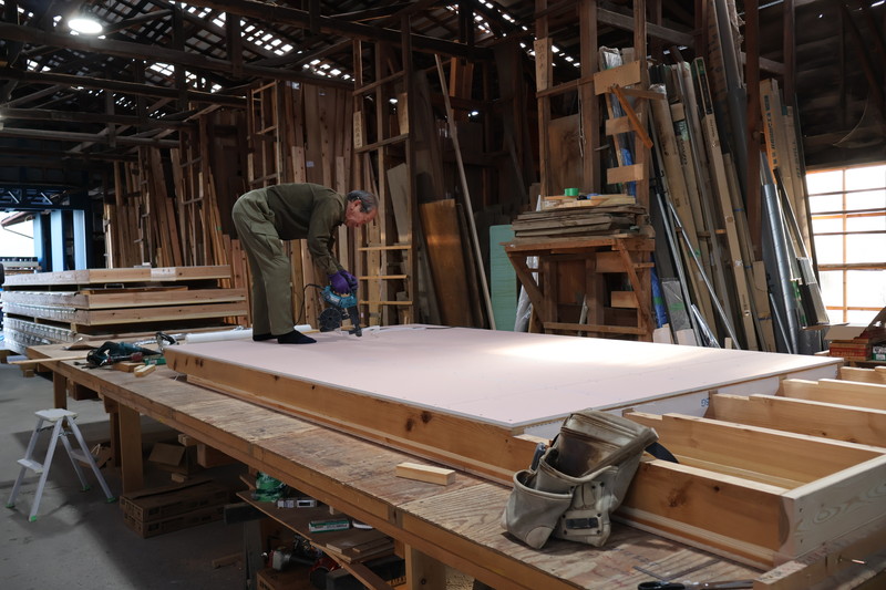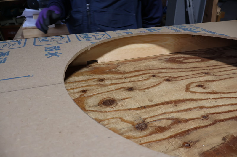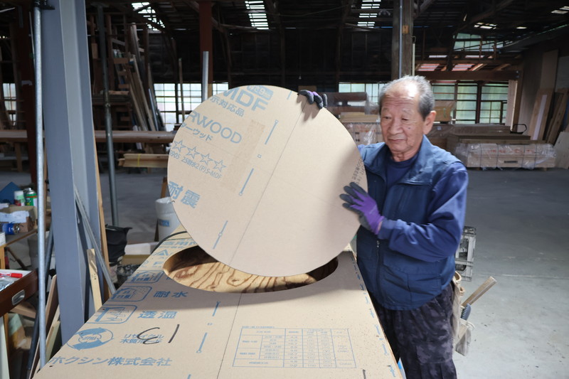この日は壁パネルを造っていましたが、丸窓付きの壁パネルの製作と聞きつけてすっ飛んできました!ヨシケンのつくる家は丸窓が度々登場します。前から製作過程を見てみたいと思っていたのでチャンス到来です✨