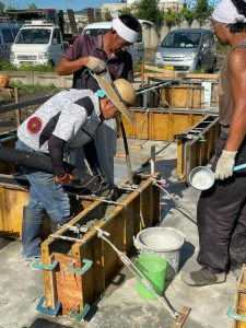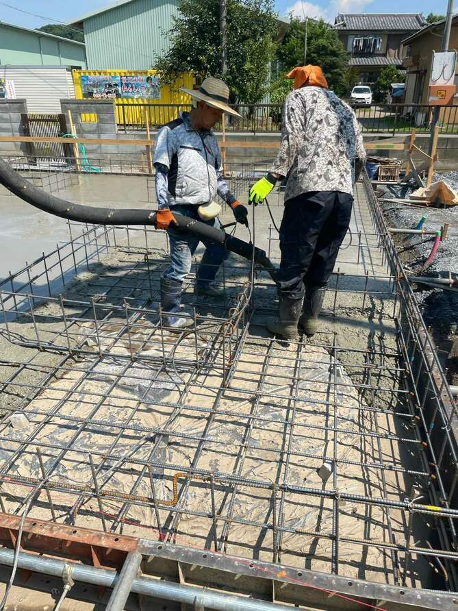 ギラギラの炎天下ですが、コンクリート打設も待ったなしです!耐圧盤コンクリートを打って、綺麗にならされました。