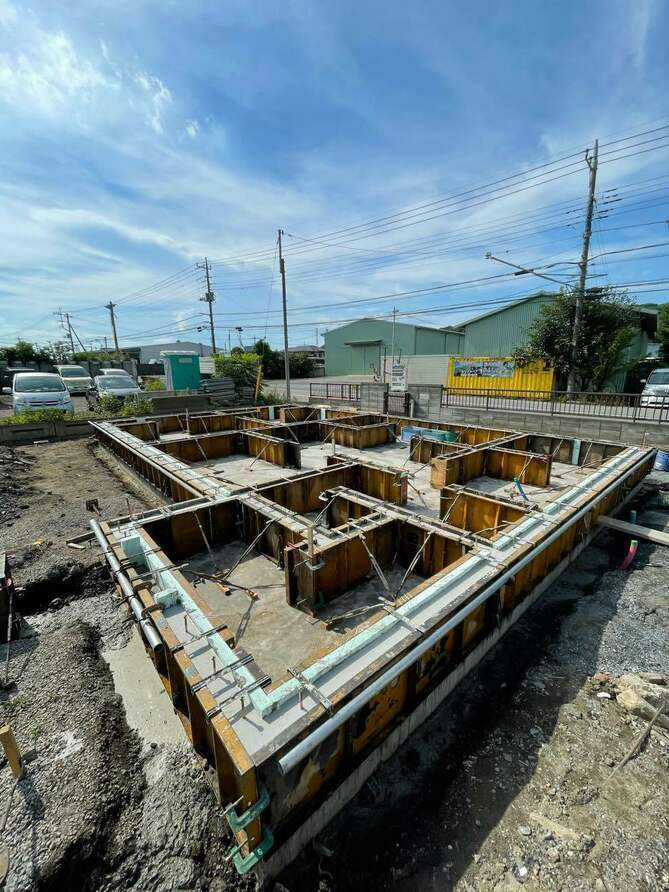何となく間取りが見えてきたような感じですね!全ての立ち上がりの型枠にコンクリートを流し込み、しっかり固まるまで数日置いて、型枠をばらすと基礎工事の完成です。