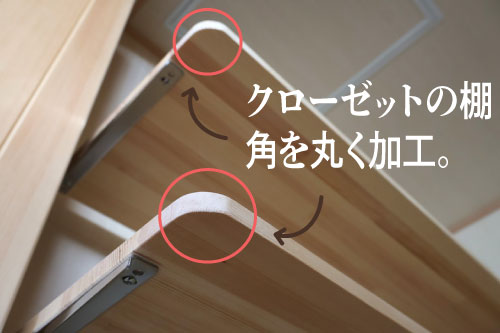 1Fクローゼットのコの字型の収納棚は、ぶつかっても安心に加工されていました!ちなみにR加工と言います(´・ω・)K部大工さんちょちょいのちょいでお手の物です✨