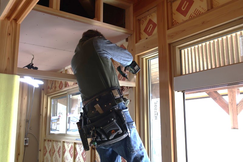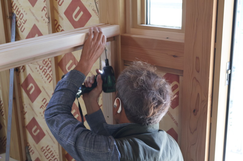 家の中では大工さんが作業をされていました。玄関ホールの受付窓が入るレールを取り付けていました。ここも木でできていることにビックリです(; ・`д・´)!