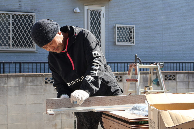 T山さんはやはり包み隠さず見せましょう。仕事に向き合うときの職人さんの表情は、本当にカッコイイものです♡外壁は現場で一枚一枚加工され、家のかたちにぴたりと寄り添うように仕上げられていきます。