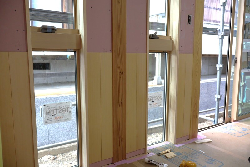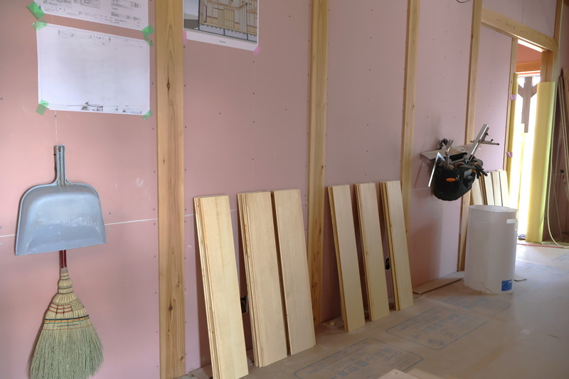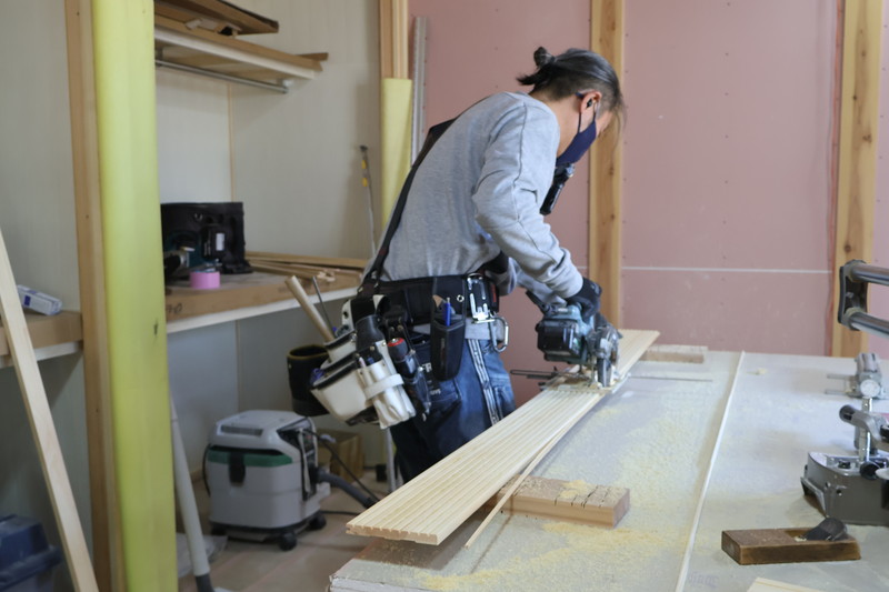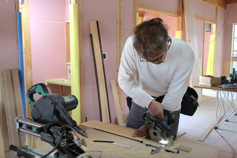 室内では大工さん達が造作中でした。この日は腰壁を造っていました。これは仕上がりが楽しみですね!