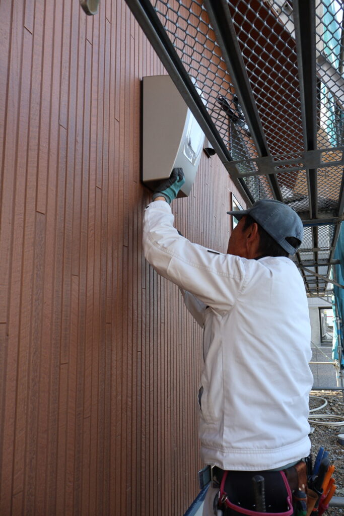 あっという間に取り付け終わってしまいました。木目調の茶色い外壁についていても違和感のない落ち着いた色味のカバーですね(´・ω・`)色味のバリエーションが少ないと言っていたF島さん。外壁のデザインとの調和、馴染み方、そこまで気を配れるF島さん…さすがです。