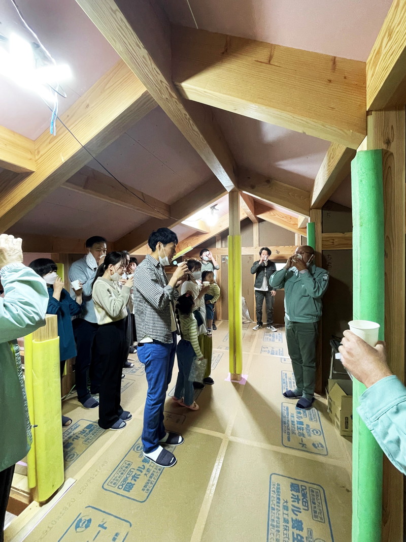 上棟とはいえ、木のひらやは大分出来上がっていたのでご自分たちの思い描いている夢のお家が、イメージしやすかったのではないでしょうか?Mちゃんも、Nちゃんも嬉しそうにニコニコと式に参加していて、自分たちの家がこれからどうやって出来上がっていくのか楽しみな様子でした~♪また、現場にもお出かけくださいね!