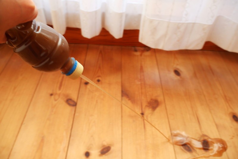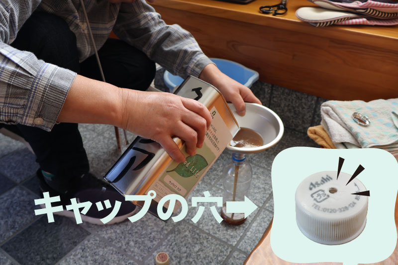 少しペットボトルを握ると、キャップに開けておいた小さな穴から出てきます。少しとろみのある液体なので、ペットボトルの握り加減で出方の調整は簡単に出来ます。