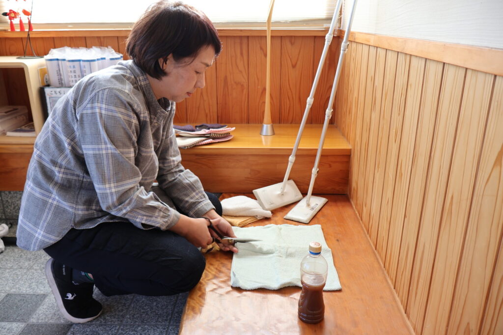柱や腰壁も同じワックスを塗っていきます。床で使った布はワックスが染み込んでいるので、ある程度はそのまま原液を足さずに再利用できます。自然素材なので素手についても危なくないですが、ベタベタしてしまうのでビニール手袋の着用をお勧めします。「力を入れて塗り込む」ではなく「軽く撫でる」で大丈夫です。