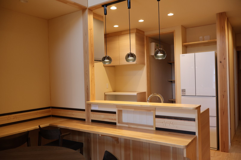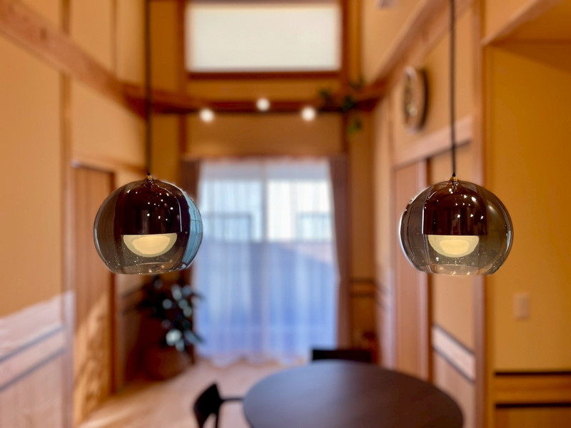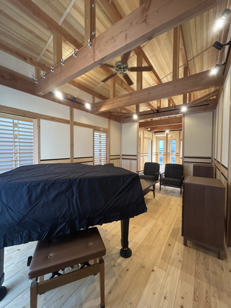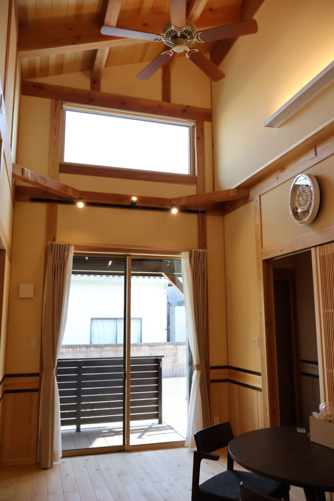 居間と法衣室は合わせて24帖と広く、間仕切りで空間を分けることもできます。お客様によるとグランドピアノは、「構造的に耐えられるか確認してください」とピアノ業者の方から言われることが多いそうです。小型の物でも300kg近くある重さに耐えられる家はなかなか無いのかもしれませんね。ヨシケンは一般在来工法に比べ3.7倍の強さが自慢ですのでご安心ください!他には天井の高さを生かした開放感に、味わいのある照明と配線デザインも要チェックです。