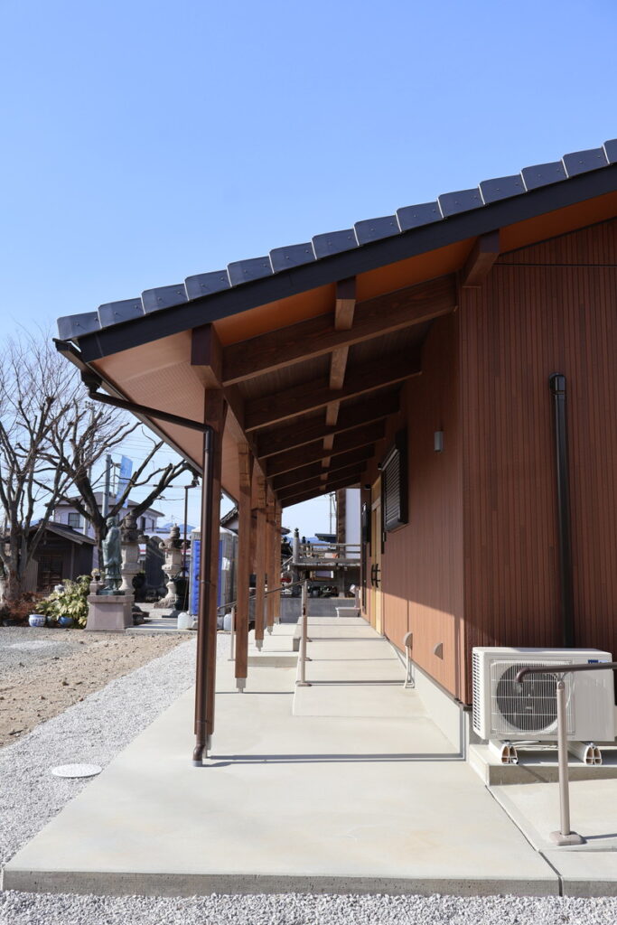 外観はブログでも何回かお披露目していますが、いかがでしょうか?この軒の長さ…なかなか珍しいデザインとなっています。隣には立派な本堂があり、合わせて見ていただきたい大屋根です。そしてスロープや手すりも完備して、庫裡へ続く玄関へ、どなたでも使いやすい優しい動線となっております。