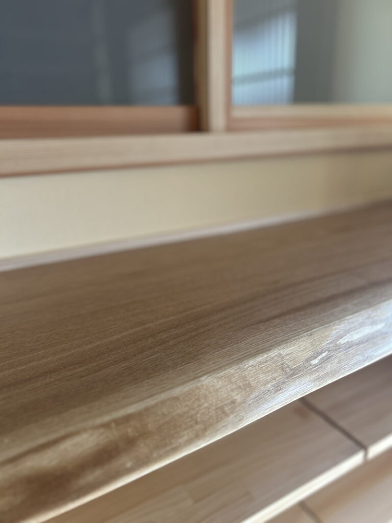 玄関を入ると、一枚板の受付カウンターが…。足元を見るとこちらも重厚感のある敷台が設置されていて、ご協力いただきました「ダイツリー」さんの作品となっております。今回も素晴らしい技術で加工していただきました。見学にお越しの際はチェックしてみてください!