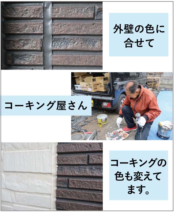 外壁の張り替えが済むと続いてコーキング屋さんが来ます。コーキングの色は調合する時もあるそうです。また、外壁の継ぎ目や窓まわりに使われているコーキングは雨水の侵入を防ぐ「防水の要」です。紫外線や温度変化によって硬くなったり、ひび割れたりするとそこから雨水が入り込み、外壁材の裏側や木部に影響が出ることがあります。小さな部分かもしれませんが、お住いの外壁チェックの際はしっかりと確認してみてください。