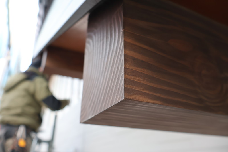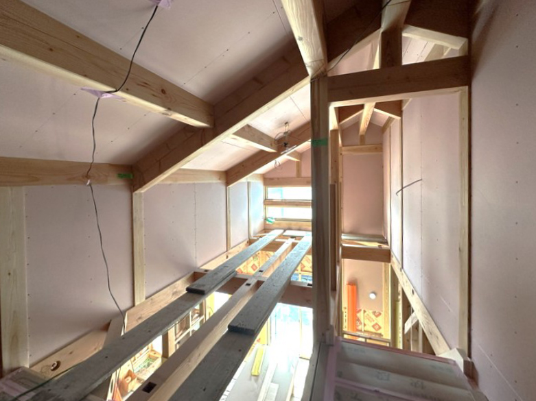 外から見える母屋(もや)は濃いめのブラウンで、外観の良いアクセントになっています。母屋は通常、屋根の内部に隠れてしまうため、こうして間近で見られるのは施工中ならではの貴重な光景です。