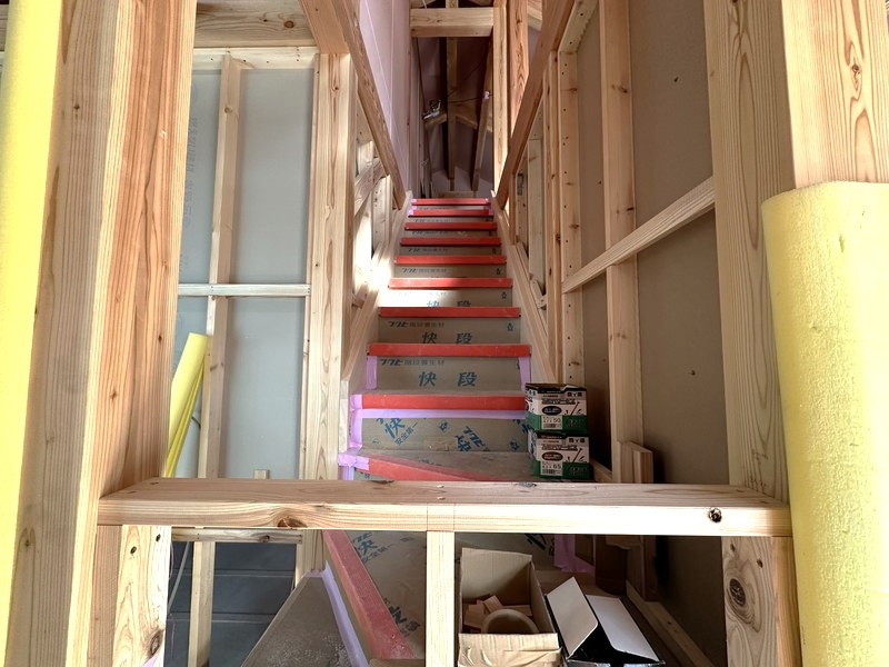 いつのまにか階段が出来ていました!昨年末の上棟式では、震えながらハシゴで上ったロフトもこれで楽々撮影できます(´▽`*)ノ