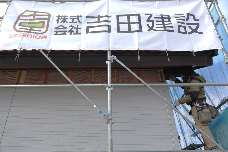 現場に着くと、晴れた青空に垂れ幕がよく映え、風に揺れる姿が思わず見惚れるほどでした✨この日は珍しく大工さんたちが不在で、外壁を取り付ける作業音だけが静かに響いていました。