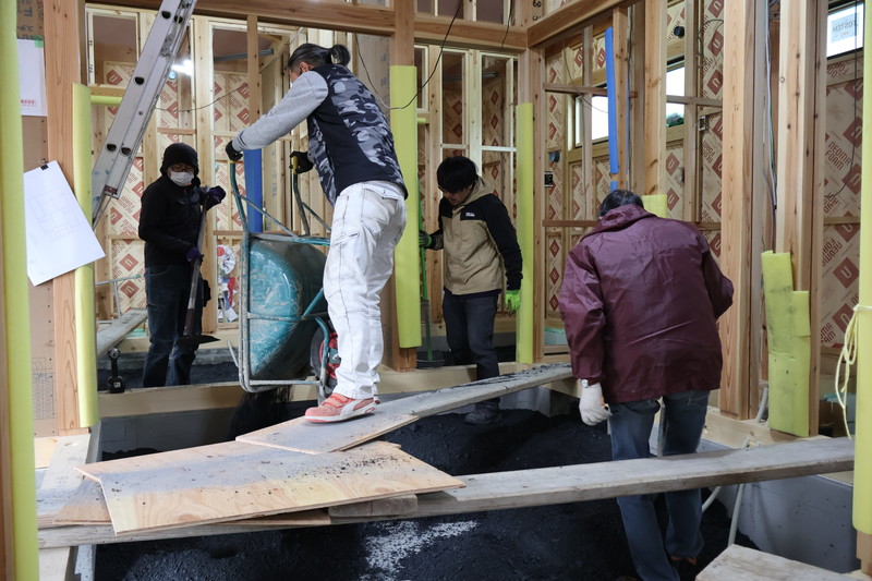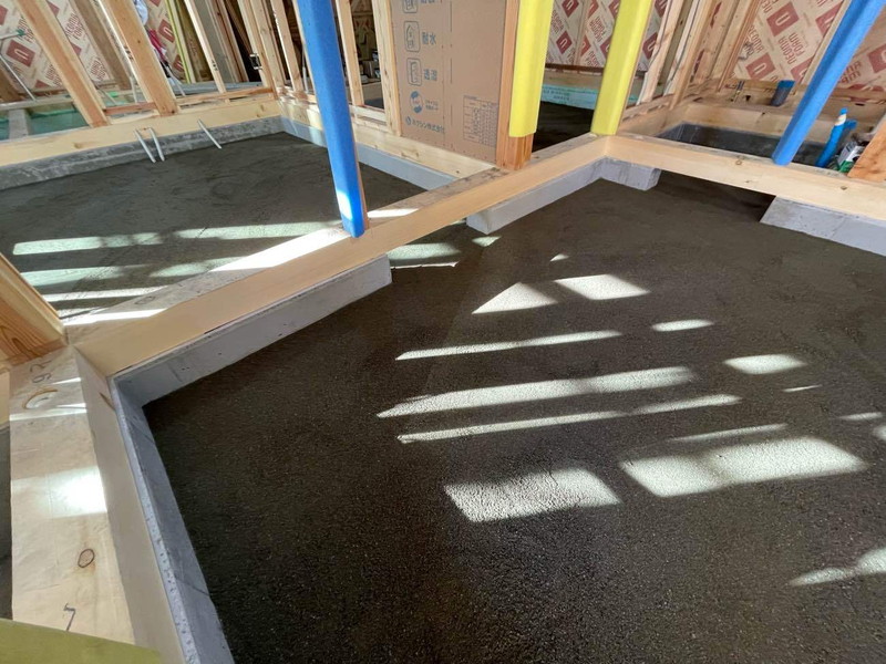 この部分は床暖房の下地でありながら、建物を支える大切な基盤。丁寧な施工が、沈下防止と次工程の安定につながります。