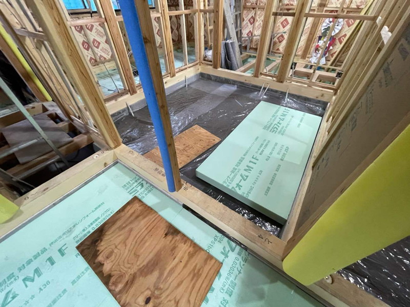 床下へ熱が逃げるのを防ぎ、床暖房の効率を高めるための層です。隙間や段差があると熱ロスにつながるため、板同士をきれいに合わせて面で整えていきます。