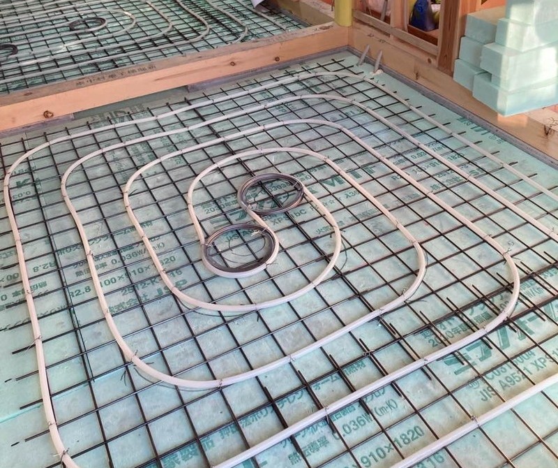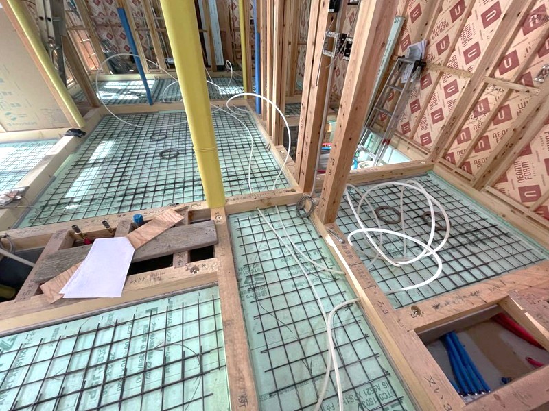 浮きがでないよう固定し、後のコンクリート打設時には補強材としても働きます。ここで床暖房の“骨格”が見え始め、全体のイメージがぐっと具体的になります。