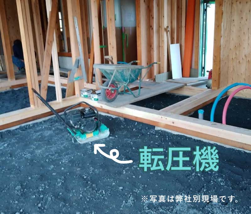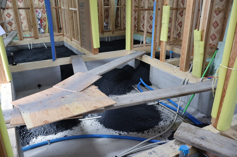 大工さんが運んだ砂利は、室内にいる専務、馬迫現場監督、福ちゃんの3名が均していきます。砂利は地面から約27センチほどの高さ…大人のふくらはぎが埋まる程度の深さになります。