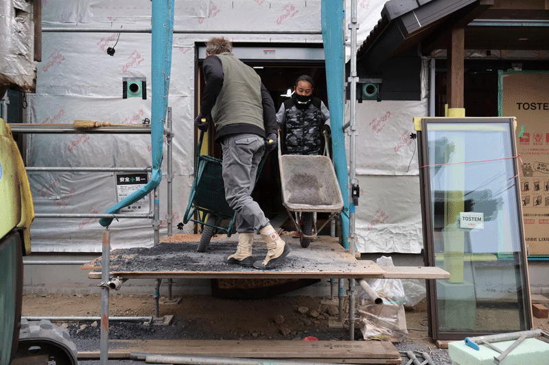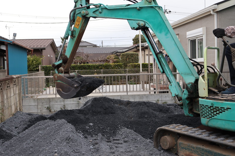 ユンボの先端、バケットですくった砂利は大工さん達が室内へ運ぶための一輪車へ。ここからは人力作業です!