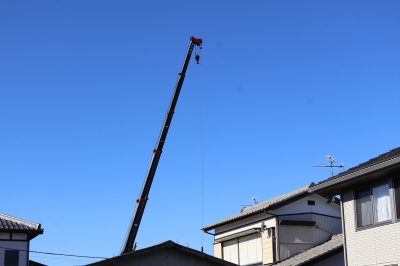 材料が続々とクレーンで運ばれ、大工さん達が取り付けていきます。室空間の上に架け渡されるものを「梁」(はり)と言い、壁の上部にあって柱の頭をつなぐものを「桁」(けた)と言います。なのでこれは梁になります。