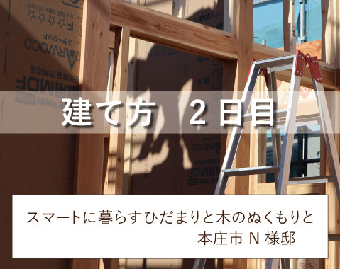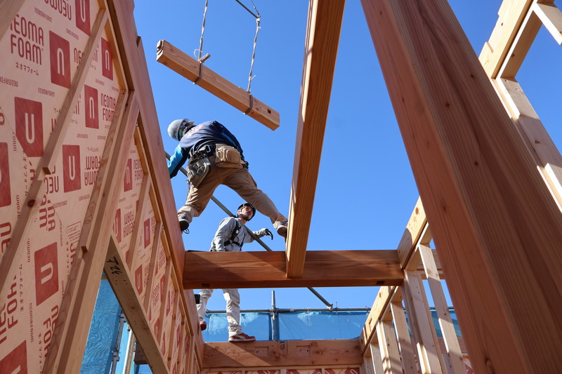 日が傾くまでこの日の作業は続きました。N様邸は平屋のつくりになりますので、職人さん達が立っている場所は、小屋裏や吹き抜けとなります(*´ω`*)