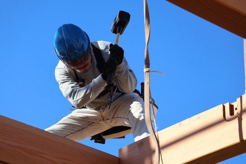 ピッタリと溝がハマるまでハンマーで叩いていきます!高所&不安定な足元でハンマーを振るということを想像しただけでもKOSHIOは足がすくみます(´゚д゚`)