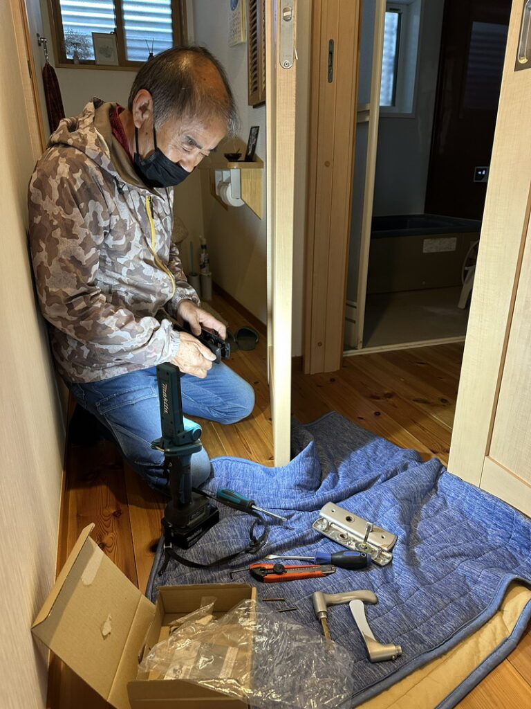 当日は、和田現場監督がトイレのドアノブを丁寧に交換しながら、K様ご夫妻と世間話を交えつつ、玄関ドアの具合も一緒に確認していました。