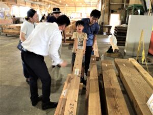 工場では木がどの様にして、強い柱や梁へと変化していくのか間近で見学することができます。この日は職人さん達も作業していましたので、よりリアルに伝わったのではないかと思います。